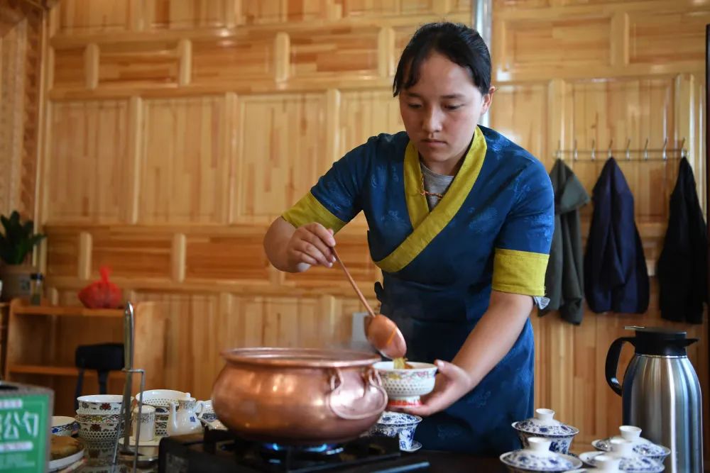 在甘肅省甘南藏族自治州卓尼縣木耳鎮(zhèn)力賽村的一家農(nóng)家樂里,村民拉姆卓瑪為客人盛湯(9月11日攝)。新華社記者 陳斌 攝