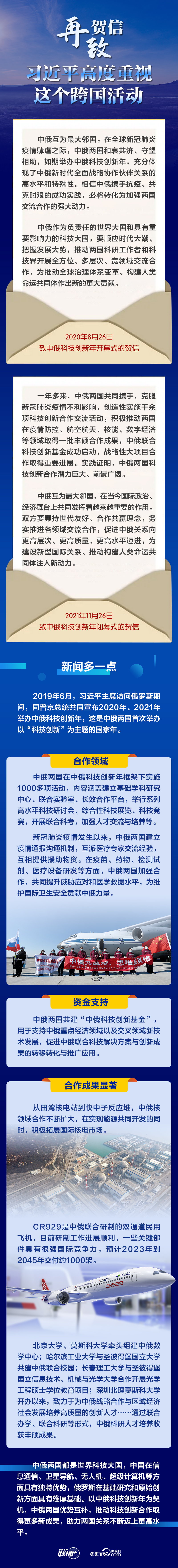11月26日,習(xí)近平主席向中俄科技創(chuàng)新年閉幕式致賀信,贊許一年多來(lái)兩國(guó)在疫情防控、航空航天、核能、數(shù)字經(jīng)濟(jì)等領(lǐng)域取得的合作成果。