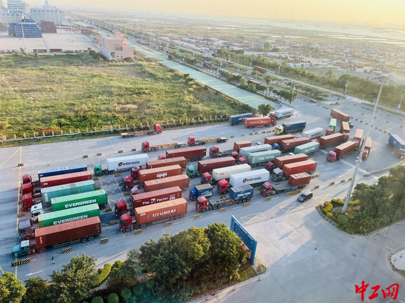 運輸貨物的集裝箱車隊正在排隊依次進入港口。中工網 王天玥攝