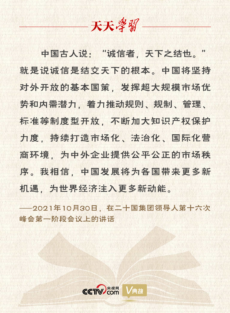習(xí)近平主席今年以視頻方式出席二十國集團(tuán)領(lǐng)導(dǎo)人第十六次峰會(huì)第一階段會(huì)議時(shí)指出,當(dāng)前,新冠肺炎疫情持續(xù)反復(fù),世界經(jīng)濟(jì)復(fù)蘇脆弱,氣候變化挑戰(zhàn)突出,地區(qū)熱點(diǎn)問題頻發(fā)。面對(duì)世界百年未有之大變局和世紀(jì)疫情,二十國集團(tuán)作為國際經(jīng)濟(jì)合作主要論壇,要負(fù)起應(yīng)有責(zé)任,為了人類未來、人民福祉,堅(jiān)持開放包容、合作共贏,踐行真正的多邊主義,推動(dòng)構(gòu)建人類命運(yùn)共同體。為此,習(xí)主席引用古語“誠信者,天下之結(jié)也”,向世界傳播中國聲音,傳達(dá)中國方案。