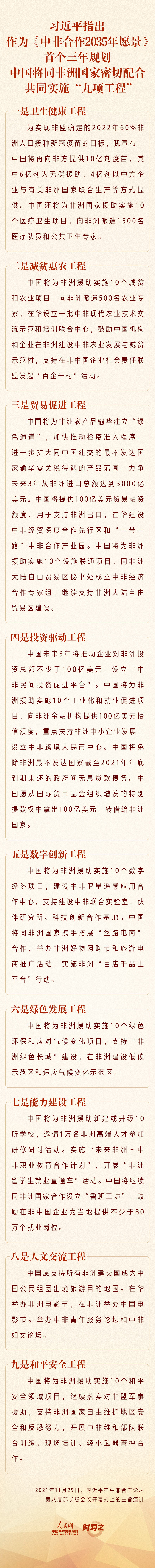 11月29日晚,國家主席習近平在北京以視頻方式出席中非合作論壇第八屆部長級會議開幕式并發表主旨演講。習近平就構建新時代中非命運共同體提出4點主張,并指出,作為《中非合作2035年愿景》首個三年規劃,中國將同非洲國家密切配合,共同實施“九項工程”。