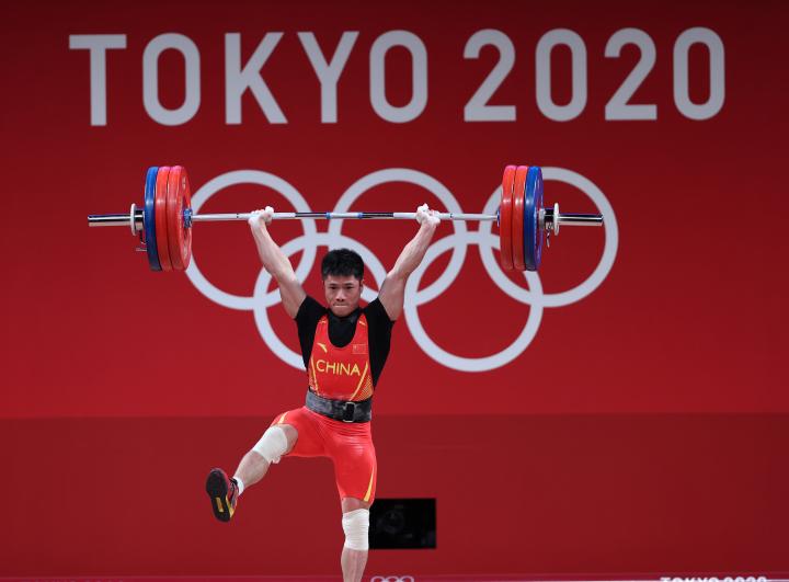 7月28日,中國選手石智勇在東京奧運會舉重項目男子73公斤級決賽中,奪得冠軍。新華社記者 楊磊 攝