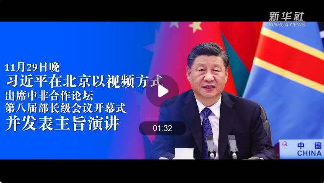 11月29日晚,國家主席習近平在北京以視頻方式出席中非合作論壇第八屆部長級會議開幕式。習近平發表主旨演講。
