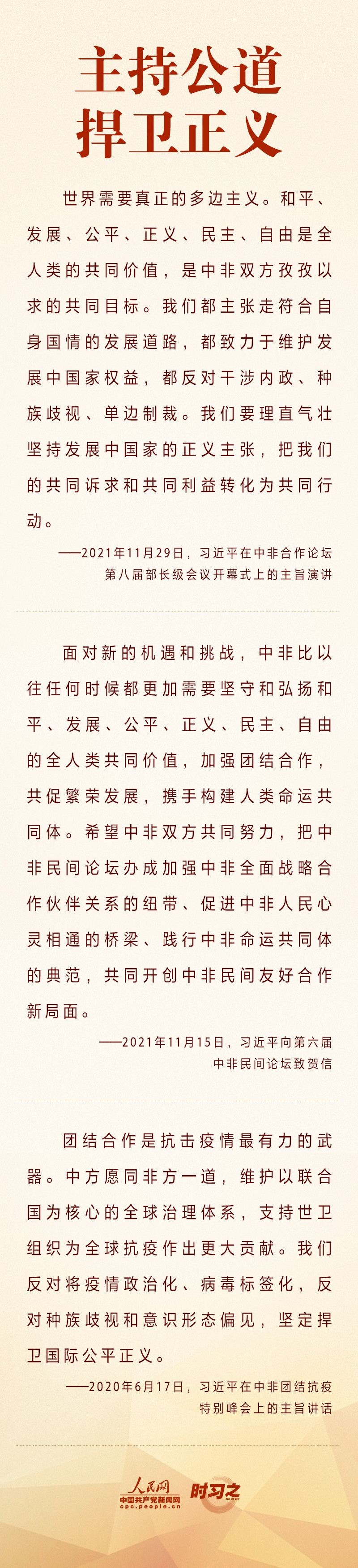 11月29日晚,國家主席習近平在北京以視頻方式出席中非合作論壇第八屆部長級會議開幕式并發表主旨演講。習近平強調,中非關系為什么好?中非友誼為什么深?關鍵在于中非雙方締造了歷久彌堅的中非友好合作精神,那就是“真誠友好、平等相待,互利共贏、共同發展,主持公道、捍衛正義,順應時勢、開放包容”。這是中非雙方數十年來休戚與共、并肩奮斗的真實寫照,是中非友好關系繼往開來的力量源泉。