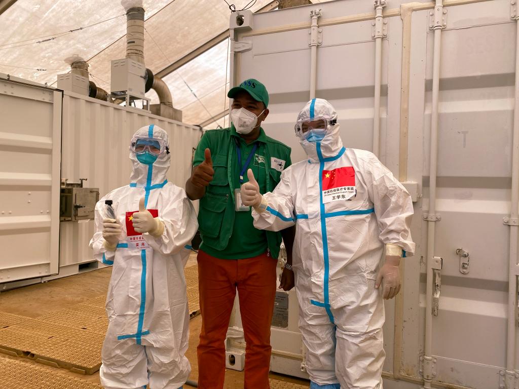 2020年9月2日,在幾內亞首都科納克里一個核酸檢測取樣點,中國抗疫醫(yī)療專家組成員與當地工作人員合影。新華社發(fā)(專家組供圖)