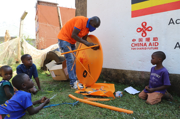 9月10日,技術人員在烏干達中部瓦基索區(qū)的布韋倫加村安裝調試數字電視設備。中國企業(yè)四達時代集團承建的“萬村通”項目讓這里的村民看上了畫面清晰而且免費的衛(wèi)星數字電視節(jié)目。新華社記者張改萍攝