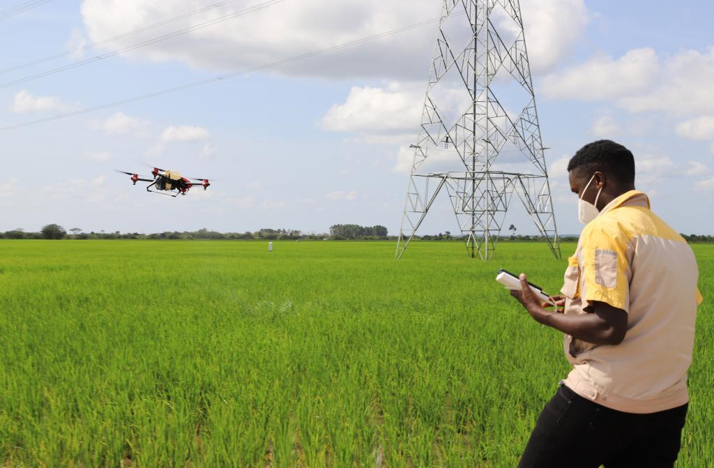 6月2日,在烏干達卡隆古區(qū)盧卡亞鎮(zhèn)中億農業(yè)園,作業(yè)員赫伯特·阿加巴操控植保無人機噴灑農藥。新華社記者張改萍攝