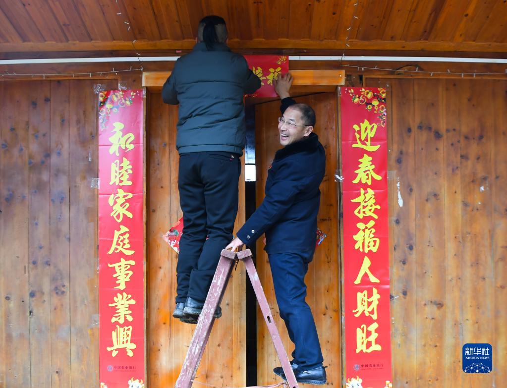 2021年2月5日,張忠富(右)在湖南省常德市石門縣金河村脫貧戶鄧先鶴家中與他一起貼春聯。新華社記者 薛宇舸 攝