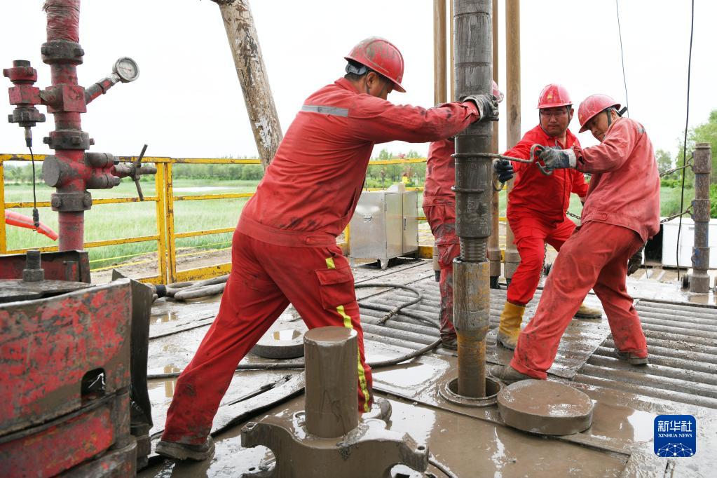 2019年6月27日,大慶油田1205鉆井隊隊長張晶(右二)與工人們在進行作業。新華社記者 王建威 攝