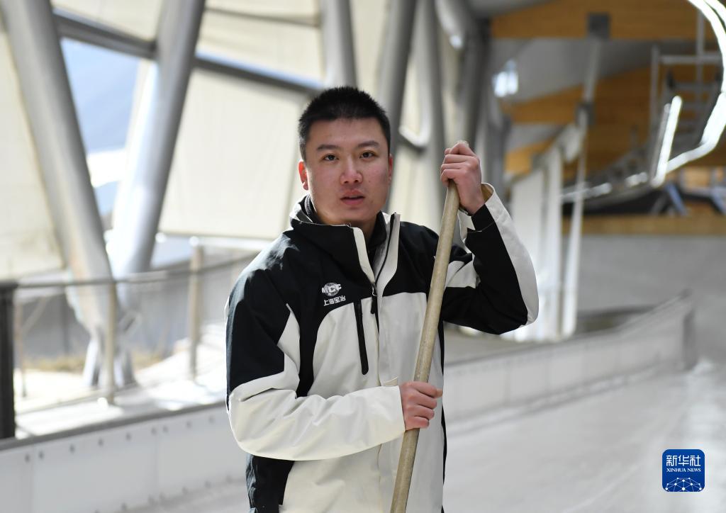 凌晨五點半,山野無聲。國家雪車雪橇中心制冰隊副隊長朱永濤穿著沖鋒衣,腳踩冰爪,手握修冰刀,迎著零下20攝氏度的山風,緊貼著冰面,把賽道平整度和光滑度手工打磨至最佳狀態。