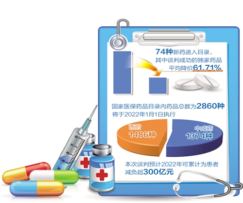 國(guó)家醫(yī)保局近日公布2021年國(guó)家醫(yī)保藥品目錄調(diào)整結(jié)果。本次調(diào)整中,共計(jì)74種藥品新增進(jìn)入目錄,包括談判調(diào)入的67種獨(dú)家藥品和直接調(diào)入的7種非獨(dú)家藥品,談判成功的獨(dú)家藥品平均降價(jià)61.71%,另有11種臨床價(jià)值不高的原目錄內(nèi)藥品被調(diào)出。調(diào)整后,新版醫(yī)保藥品目錄內(nèi)藥品總數(shù)2860種,將于2022年1月1日?qǐng)?zhí)行。