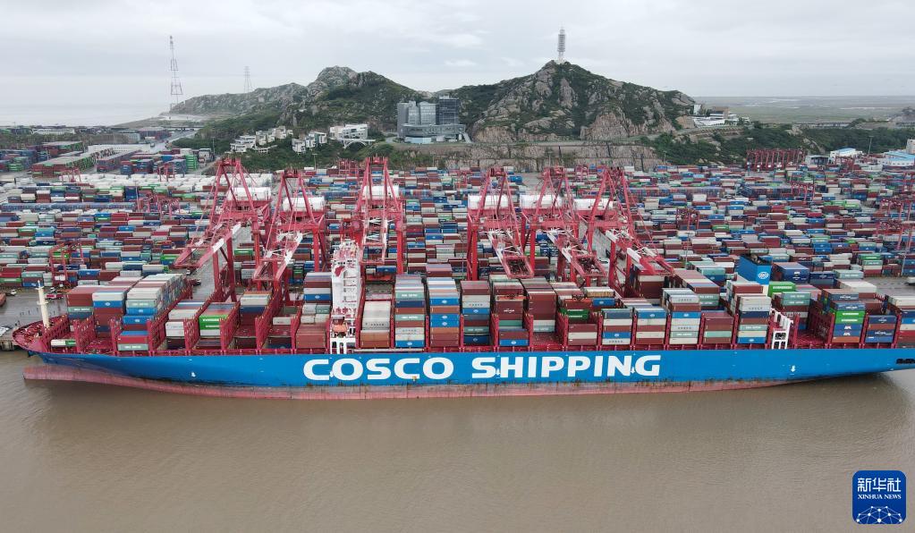 中遠海運“天秤座”輪停泊在上海洋山港二期碼頭(10月13日攝,無人機照片)。新華社記者 方喆 攝
