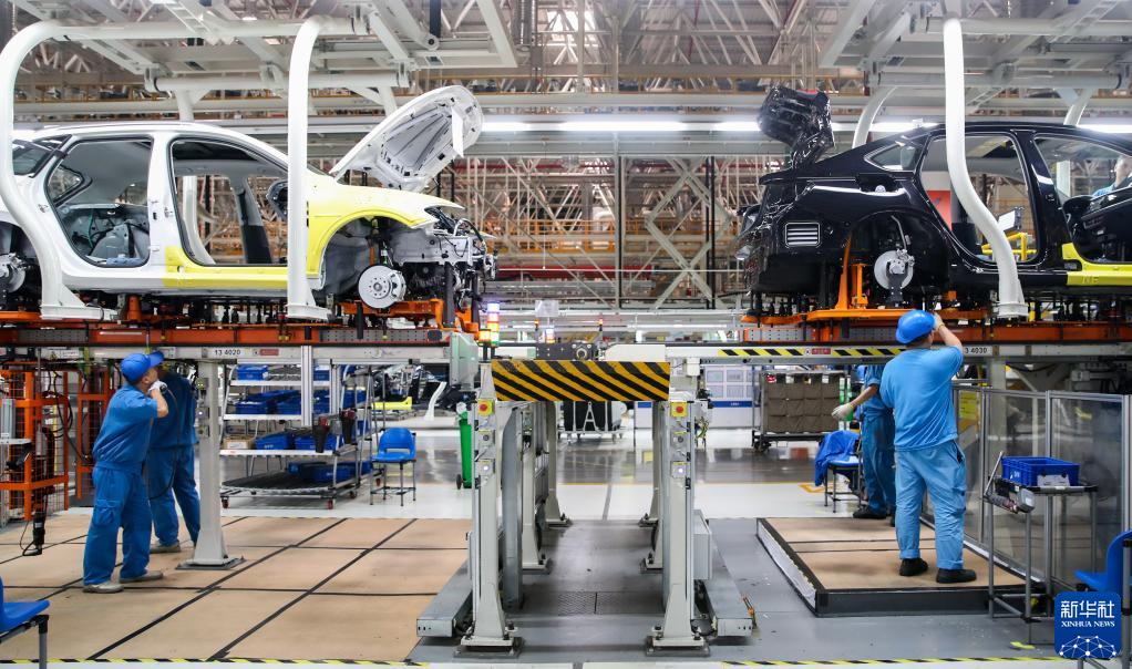 在上汽大眾生產車間內,工作人員在生產流水線上作業(2018年10月30日攝)。新華社記者 丁汀 攝