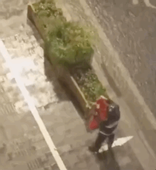 大雨中,防汛隊員撿起被吹落在地的國旗,仔細疊好收進雨衣。
