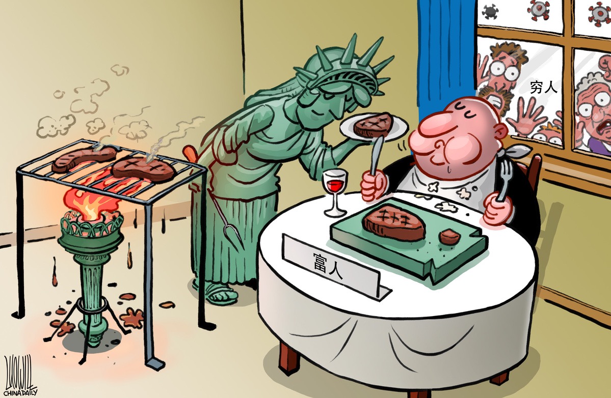 美國(guó)民眾基本生存權(quán)得不到保障。截至2020年底,超過(guò)5000萬(wàn)美國(guó)人面臨食物不足問(wèn)題,該數(shù)字相較于2019年增加了近50%;超過(guò)22萬(wàn)人露宿街頭。貧富差距愈演愈烈。