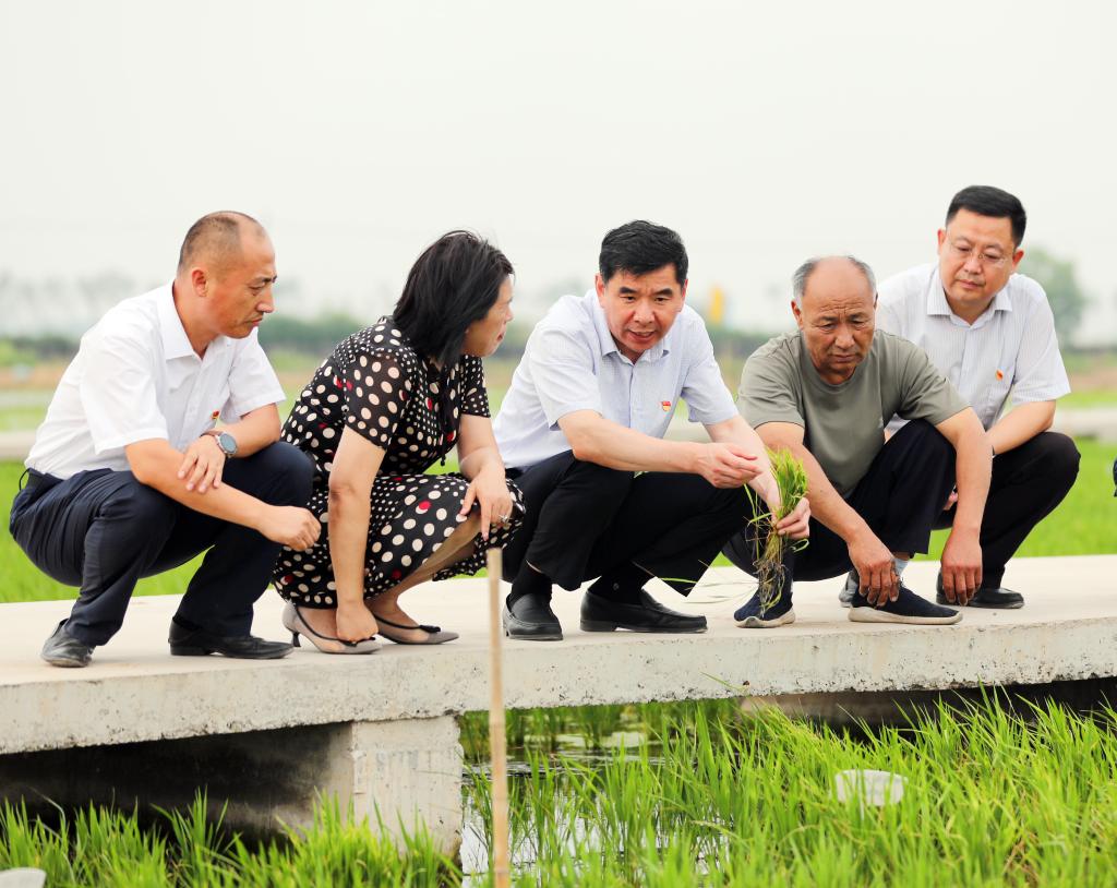 7月2日,在東營(yíng)市墾利區(qū)一邦農(nóng)業(yè)公司耐鹽堿水稻實(shí)驗(yàn)基地,墾利區(qū)委書記劉斯杰(中)和企業(yè)負(fù)責(zé)人察看水稻長(zhǎng)勢(shì)。新華社發(fā)(程永鋒攝)