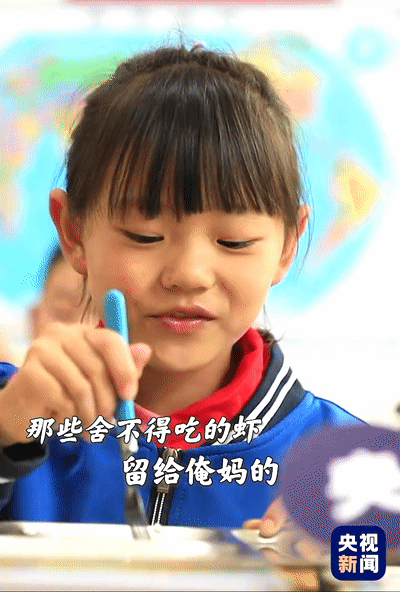 8歲女孩張笑笑在學校吃午餐時,唯獨留下了盤子里的蝦,一句“留給俺媽”戳中無數人的心。