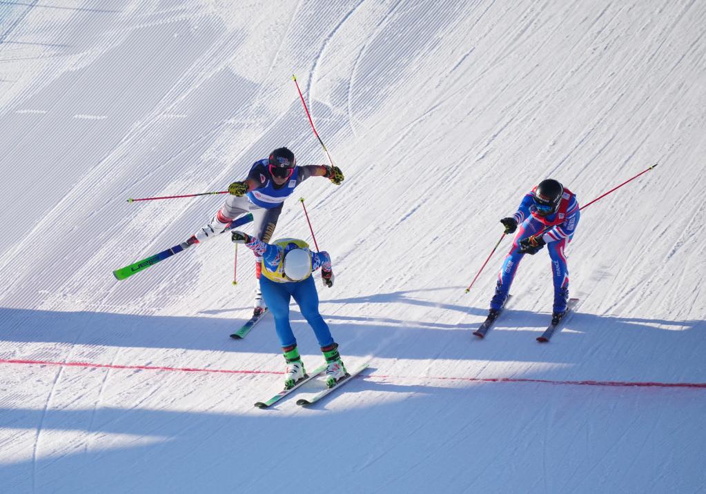 圖為11月27日,俄羅斯選手謝爾蓋·里齊克(前)在北京2022年冬奧會張家口賽區(qū)云頂滑雪公園舉行的“相約北京”系列測試賽中沖過終點(diǎn)。新華社記者 楊世堯 攝
