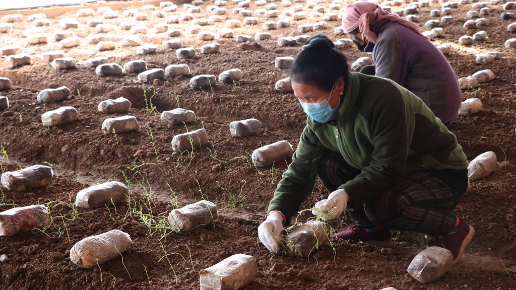 寒冬時(shí)節(jié),呼嘯的北風(fēng)從高原上猛烈吹過(guò),四下一片荒蕪冷清。而在王和平的大棚里,大伙正揮舞著鐵鍬,將菌棒埋進(jìn)土里,不少人把毛衣外套掛在棚壁上,熱火朝天的氣息與棚外的寒意形成了鮮明對(duì)比。