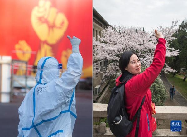 這是一張拼版照片。左圖為2020年2月12日,安徽援鄂醫療隊隊員周國紅在武漢體育中心方艙醫院前豎起拇指為自己和同伴加油;右圖為2021年3月13日,周國紅在武漢大學櫻花樹前拍照留念。