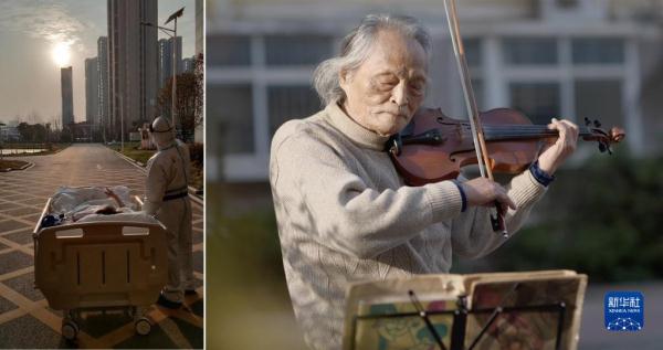 這是一張拼版照片。左圖為2020年3月5日傍晚,在武漢大學人民醫院東院,復旦大學附屬中山醫院支援湖北醫療隊醫生在護送患者王欣做CT的途中停下,讓住院近一個月的老人欣賞久違的日落(甘俊超攝);右圖為2021年3月24日,“看夕陽的老人”王欣在湖北省武漢市東西湖區園藝花城小區內拉小提琴(新華社記者熊琦攝)。