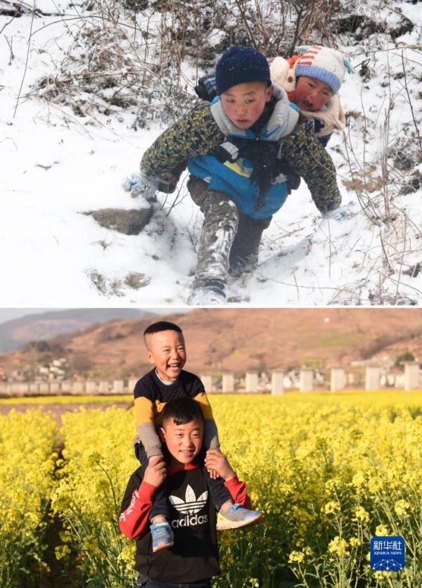這是一張拼版照片。上圖為:2018年2月2日,吉覺吉竹背著弟弟下山,前往易地扶貧搬遷的外公家;下圖為:2021年2月24日,吉覺吉竹和弟弟在四川省涼山彝族自治州越西縣南箐鎮新家附近的油菜地里玩耍。