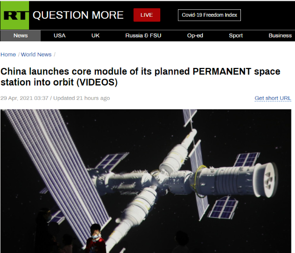 4月29日11時23分,搭載著中國空間站天和核心艙的長征五號B遙二運載火箭,在我國文昌航天發射場發射升空,準確進入預定軌道。外媒認為,這是中國將人類送入太空的計劃中的重要里程碑,中國空間站在不久的將來會是人類近地軌道上唯一運行的空間站。