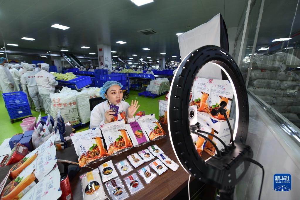 在廣西一家螺螄粉生產企業車間,工作人員在直播銷售螺螄粉(6月17日攝)。新華社記者 黃孝邦 攝