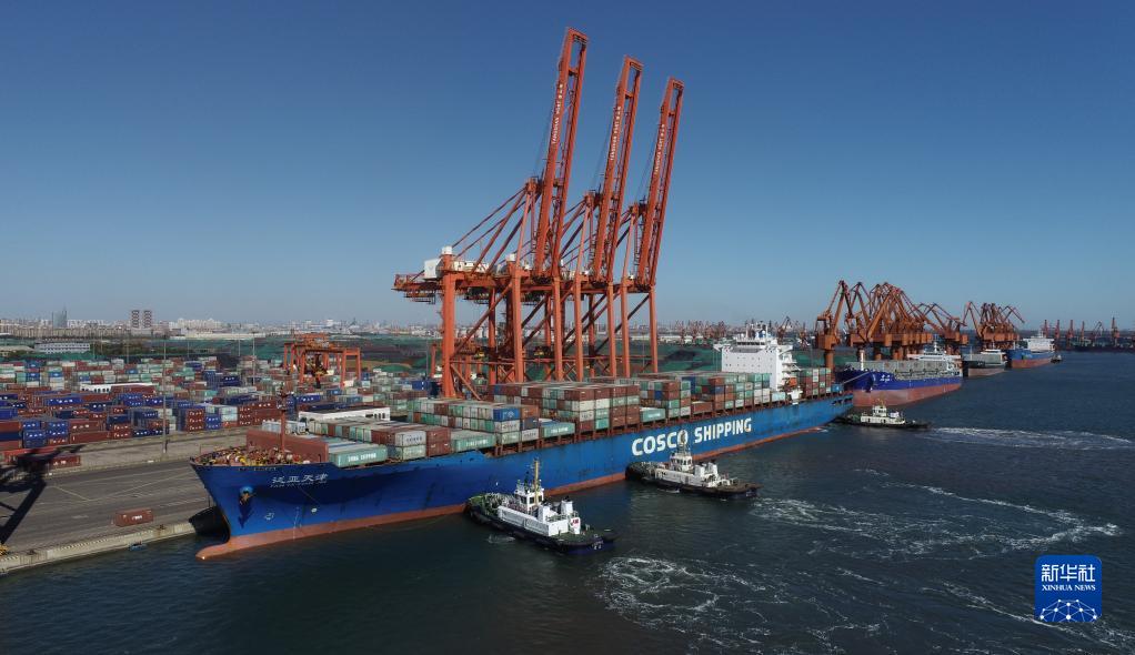 10月23日,一艘輪船在拖輪的協助下向唐山港京唐港區集裝箱碼頭靠泊(無人機照片)。新華社記者 朱旭東 攝