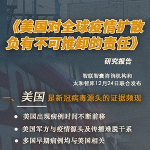智聯(lián)智囊咨詢機(jī)構(gòu)和太和智庫12月24日聯(lián)合發(fā)布《美國對全球疫情擴(kuò)散負(fù)有不可推卸的責(zé)任》研究報告。報告指出,多項數(shù)據(jù)和信息顯示,美國才最有可能是新冠病毒的“起源國”,是導(dǎo)致疫情在全球快速擴(kuò)散的罪魁禍?zhǔn)祝绹恼位倥亲屓驊?zhàn)勝疫情步履維艱,面臨嚴(yán)重挑戰(zhàn)。(記者孫楠、王賓)