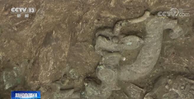 三星堆遺址祭祀區考古工作隊 趙昊:而且這個龍的形態有點奇怪,它的頭像一個老虎頭一樣,而且耳朵也是老虎的圓耳朵,頭上長著一個比較長的一個犄角,這是它的比較圓的耳朵,眼睛在這里。這個比較特別,它是在嘴里面銜了一個像刀一樣的一個東西。現在相當于這個龍的側面對著我們。