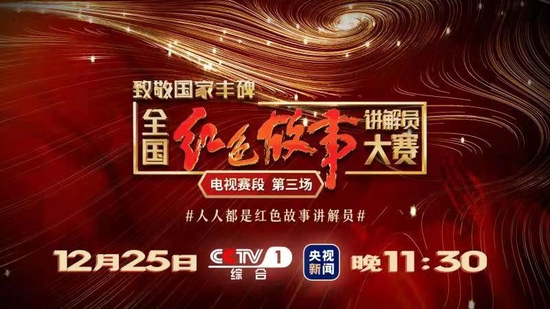 《致敬國家豐碑——全國紅色故事講解員大賽》電視賽段第三場于12月25日晚11:30,在央視新聞新媒體全平臺并機綜合頻道CCTV-1播出,講解紅色故事,致敬國家豐碑!