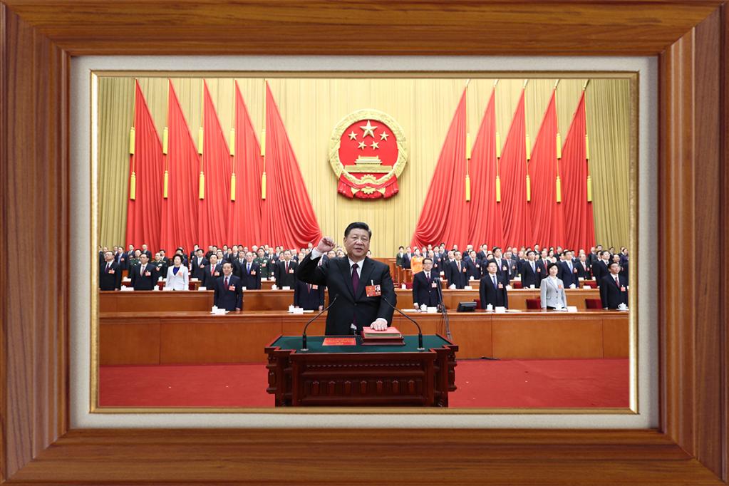 這一張工作照,是習近平連任國家主席后,向憲法宣誓。自發表2019年新年賀詞起,就一直擺在書架上。