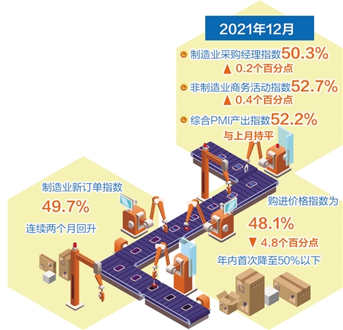 經(jīng)濟(jì)日報(bào)北京12月31日訊(記者熊麗)國家統(tǒng)計(jì)局服務(wù)業(yè)調(diào)查中心、中國物流與采購聯(lián)合會31日發(fā)布的數(shù)據(jù)顯示,2021年12月,制造業(yè)采購經(jīng)理指數(shù)和非制造業(yè)商務(wù)活動指數(shù)分別為50.3%和52.7%,比上月上升0.2個和0.4個百分點(diǎn);綜合PMI產(chǎn)出指數(shù)為52.2%,與上月持平。