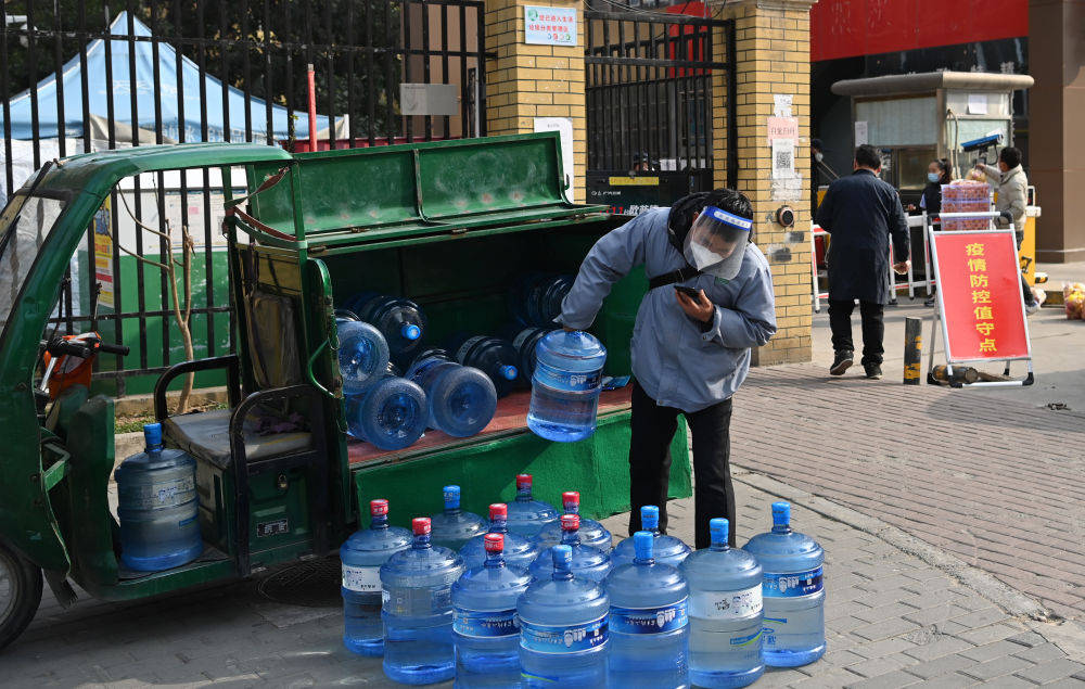 1月10日,一家快遞企業(yè)員工在為蓮湖區(qū)一小區(qū)配送純凈水。新華社記者 陶明 攝