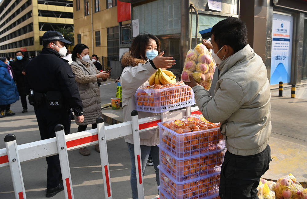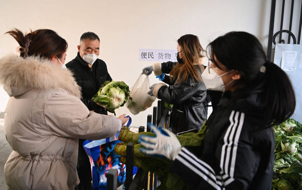 1月10日,雁塔區(qū)科技路一小區(qū)的工作人員在為居民配送愛心人士捐贈(zèng)的蔬菜。新華社記者 陶明 攝