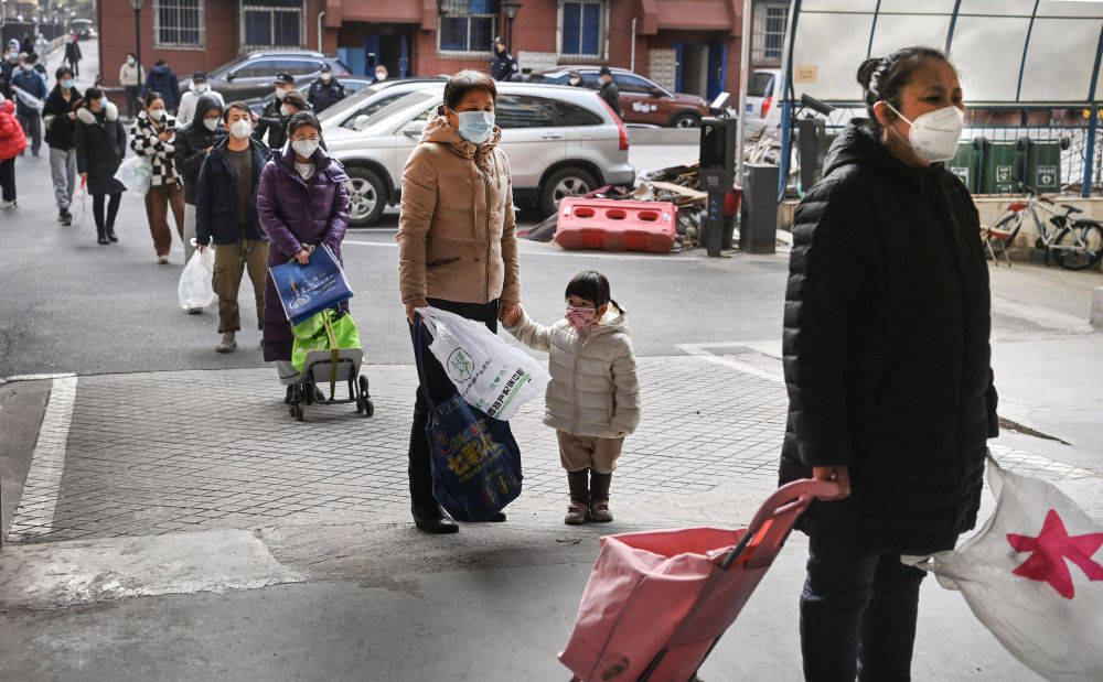 1月10日,雁塔區(qū)科技路一小區(qū)的居民排隊(duì)領(lǐng)取愛心人士捐贈(zèng)的生活物資。新華社記者 陶明 攝