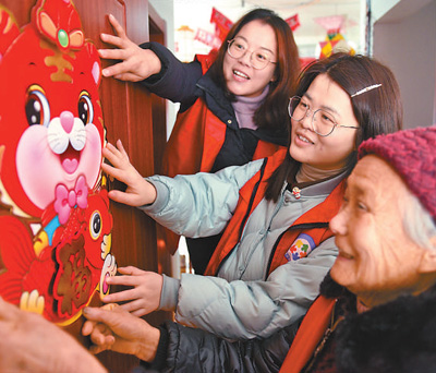 近日,安徽省當涂縣五彩社會工作服務中心的志愿者與空巢老人一起貼年畫,為老人家增添節(jié)日喜慶氣氛。