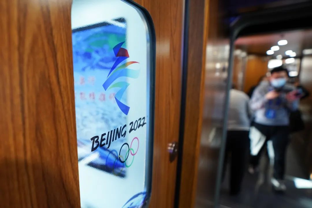 這是2022年1月6日在G9981次北京冬奧列車內拍攝的北京2022年冬奧會會徽。新華社記者 鞠煥宗 攝