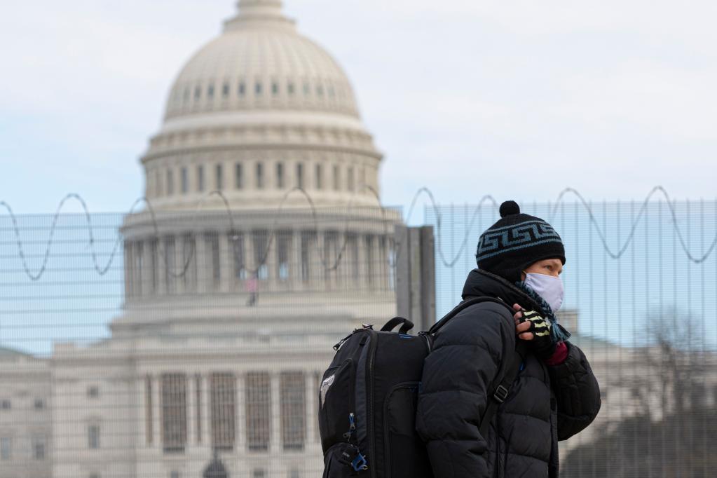 2021年1月24日,在美國首都華盛頓,一名男子戴著口罩從國會大廈附近經過。新華社發(亞倫 攝)