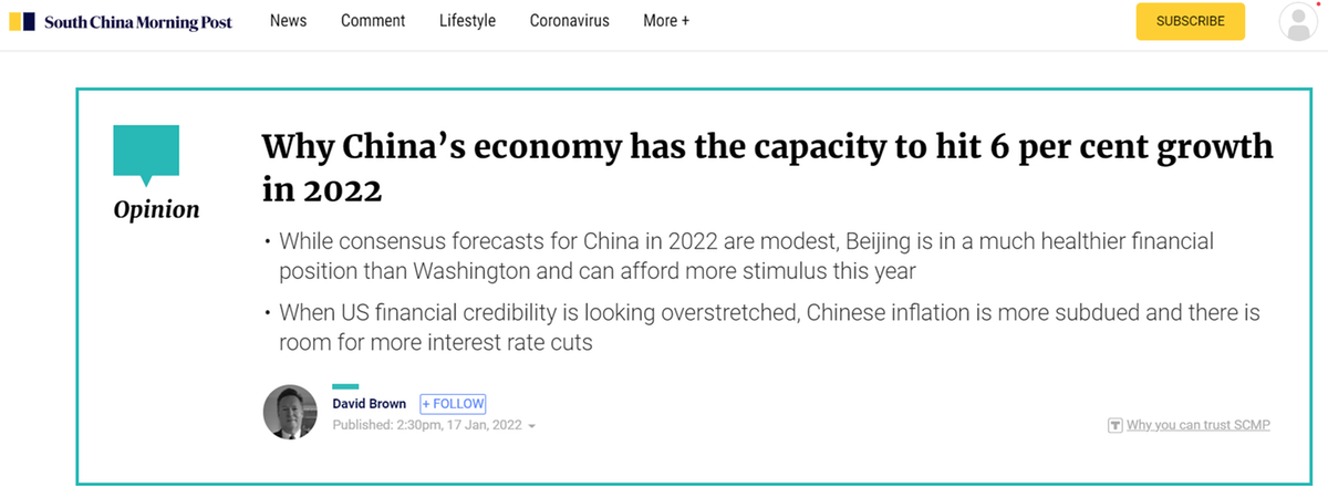 香港《南華早報》評論認(rèn)為,中國的金融狀況要比美國健康得多,政策空間很大。中國經(jīng)濟(jì)有能力在 2022 年實現(xiàn) 6% 的增長。