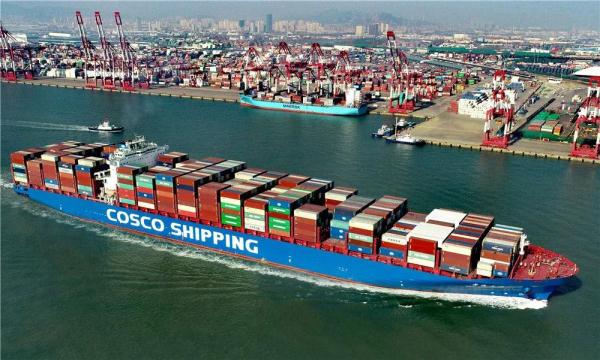 2021年2月19日,在位于山東自貿試驗區青島片區的山東港口青島港前灣集裝箱碼頭,一艘滿載集裝箱的貨輪駛出港口(無人機照片)。新華社發(張進剛攝)