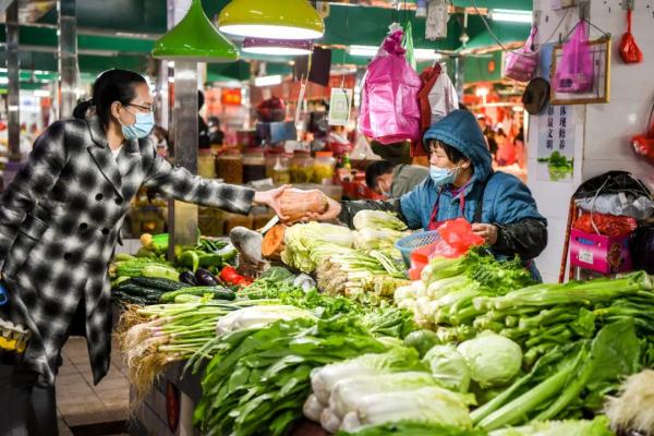 2021年12月27日,市民在東興市一處菜市場內購買蔬菜。新華社記者 曹祎銘 攝
