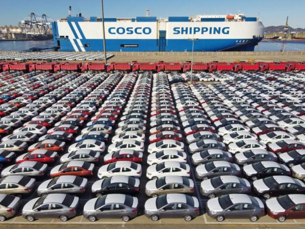 大批出口商品車在山東港口煙臺港集結等待裝船(2021年12月7日攝,無人機照片)。新華社發(唐克 攝)