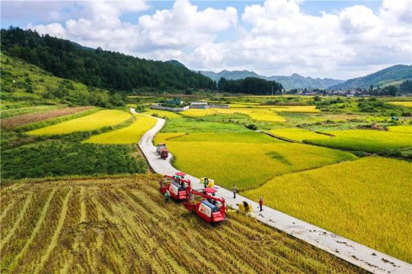 2021年9月15日,貴州省龍里縣灣灘河鎮羊場社區的農民在搶收稻谷(無人機照片)。新華社記者楊文斌 攝