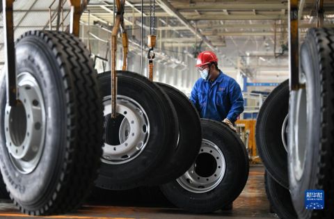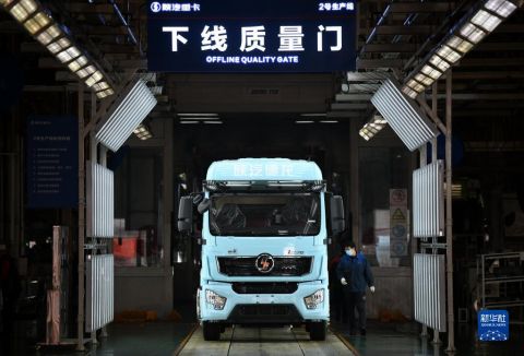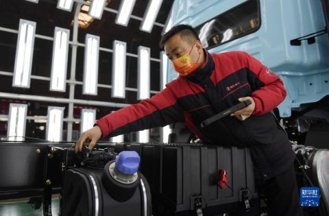 1月20日,工作人員在陜西汽車控股集團有限公司總裝車間進行重型卡車驗收。 新華社記者 李一博 攝