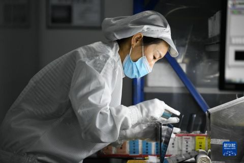 1月18日,在隆基綠能科技股份有限公司西安切片工廠,工人在進行檢測包裝作業。 新華社記者 李一博 攝