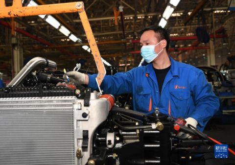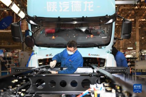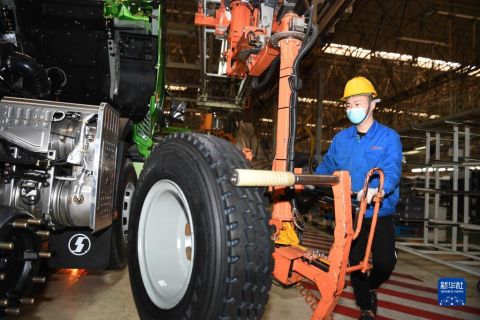 1月20日,工人在陜西汽車控股集團有限公司總裝車間進行重型卡車裝配。 新華社記者 李一博 攝