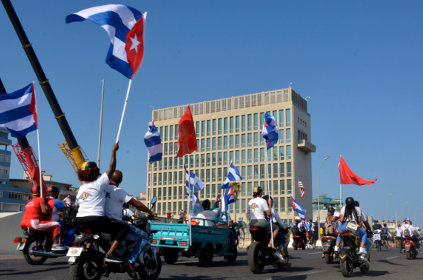 2021年3月28日,參加游行的車隊(duì)經(jīng)過位于哈瓦那的美國駐古巴大使館。新華社發(fā)(華金·埃爾南德斯攝)