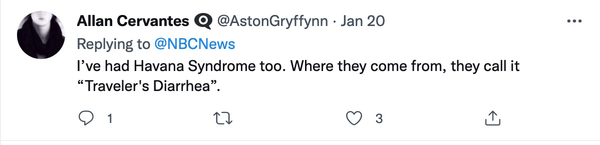 “他們不知道(‘哈瓦那綜合征’)是由什么引起的,但他們知道不是誰(shuí)造成的。呵呵……”